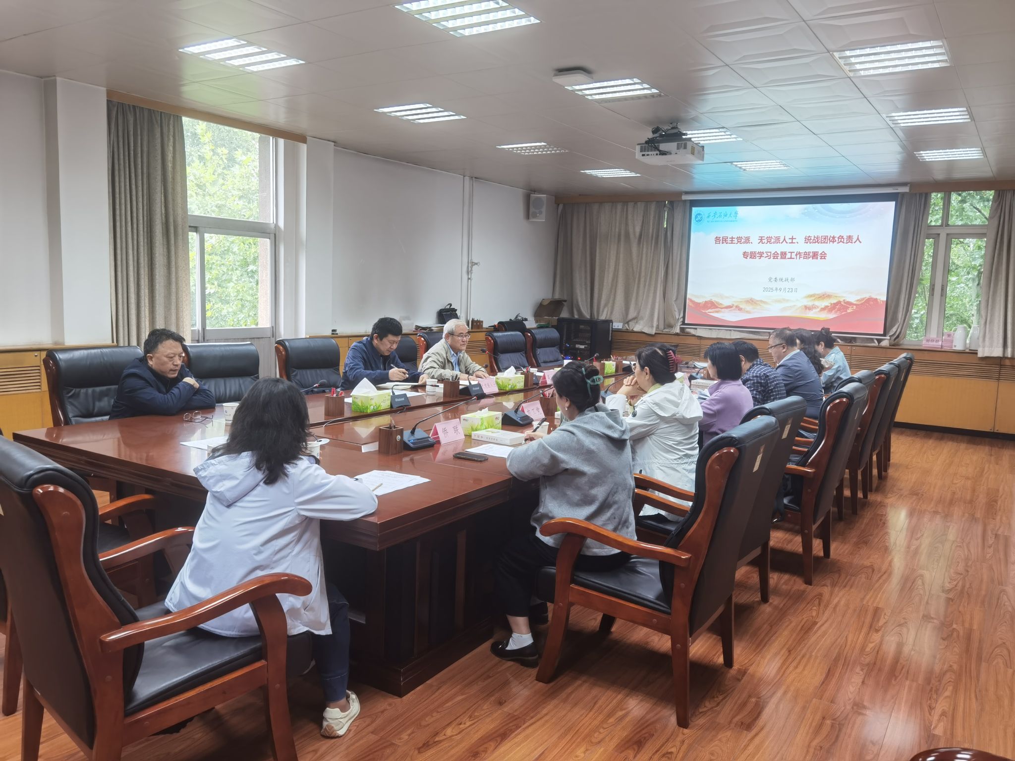 为进一步加强政治理论学习,持续推进各民主党派、无党派人士“学规定、强作风、树形象”主题教育,安排部署本学期重点工作,学校于9月23日上午在雁塔校区行政楼五楼会议室召开各民主党派、无党派人士、统战团体负责人专题学习会暨工作部署会,各民主党派支部委员,无党派人士负责人,侨联、留联会、知联会负责人参加。会议由党委统战部部长吴复雷主持。
