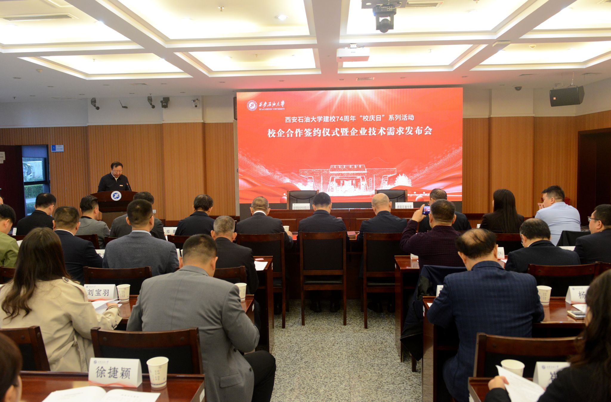 王进富在讲话中对各位校友企业家在校庆日专程返校表示热烈欢迎,对各企业长期以来给予学校的大力支持表示衷心感谢,对校企双方未来的深度合作表示无限期待。他指出,学校近年来始终紧扣能源行业和产业发展需求,紧密围绕人才培养、科学研究和社会服务三大职能,积极探索产学研用协同创新模式,推进教育科技人才一体化协同发展。此次在学校建校74周年校庆日这一特殊时刻,选择以校企合作签约与技术需求发布的形式开展交流,既是学校“开放办学、智慧办学、服务办学”理念的生动实践,更是基于行业高校定位,将企业的真实课题、真实场景、真实需求融入学校人才培养全过程的务实之举。他强调,当前学校正在全面推进教育、科技、人才一体改革,将以“改革”为主线,以“融合”为路径,重点推动五个方面的融合:一是培养目标融合学校将围绕企业实际需求,聚焦在校学生、青年教师、企业技术骨干等群体,推动人才培养与企业需求精准对接,定制培养方案,实现人才供需对接;二是教材课程融合学校将重构课程体系,建设和完善大学科技园区和企业工程实验室,与企业共同参与教材课程编写,不断把企业工程场景、技术成果融入到教育教学中;三是师资力量融合学校将建立企业专家任教机制,引入具有丰富工程实践经验的人才参与到教育教学中来,不断打造“双师型”教学团队;四是实习就业融合学校将加强与企业的深度融合,通过科研项目参与、课题研究实践等形式贯通学生的实习实践与就业发展道路;五是评价标准融合学校将持续构建学校人才培养与企业岗位标准相衔接的学生评价体系。他期待与广大校友企业深度融合,充分发挥校企双方各自优势,加强在人才联合培养、科研联合攻关等方面的务实合作,共同培育更多高素质人才,共同为保障国家能源安全和推动石油石化行业高质量发展贡献力量。