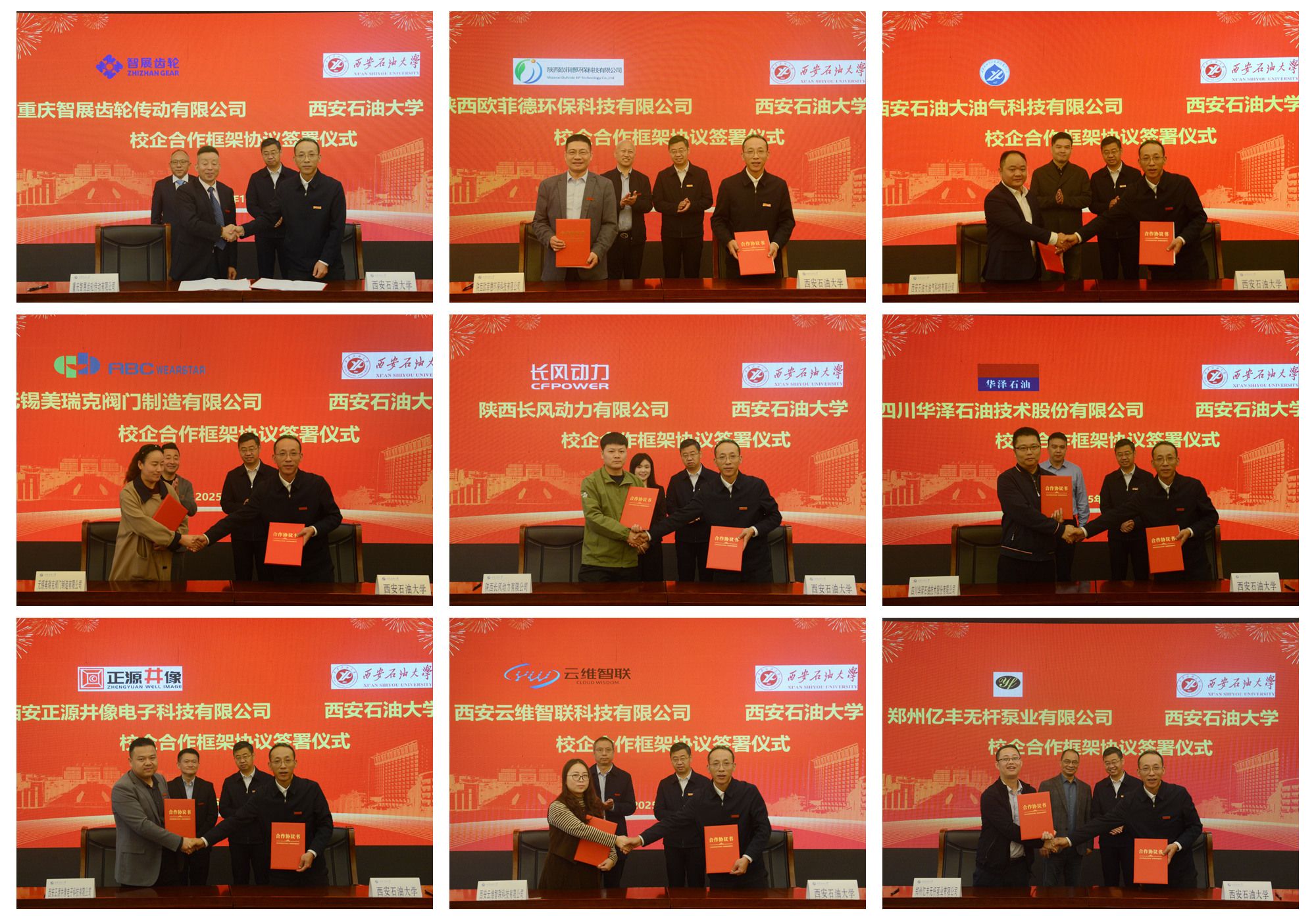 10月12日上午,我校在鄠邑校区隆重举行校企合作签约仪式暨企业技术需求发布会。校长王进富、校党委副书记张木、副校长张君涛及重庆智展齿轮传动有限公司董事长何荣、陕西欧菲德环保科技有限公司董事长卜涛、西安石油大油气科技有限公司董事长邓鹏、陕西长风动力有限公司总经理王东芹、无锡美瑞克阀门制造有限公司总经理孙海东、四川华泽石油技术股份有限公司总经理张晨、西安正源井像电子科技有限公司总经理王晓农、西安云维智联科技有限公司总经理王红春、郑州亿丰无杆泵业有限公司总经理徐正国出席会议。会议由副校长种宇宏主持。