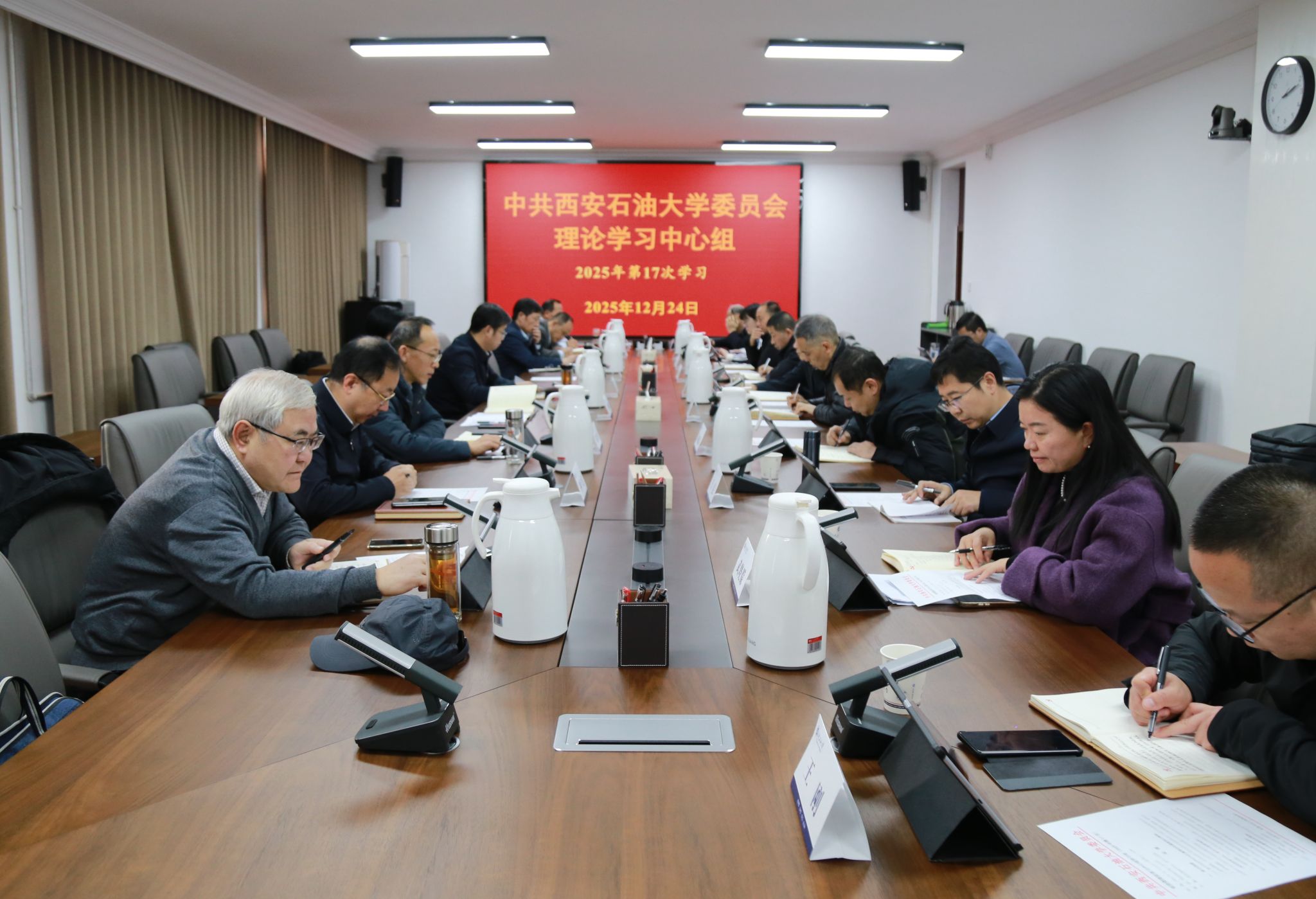 12月24日下午,校党委理论学习中心组2025年第17次学习会在鄠邑校区第三会议室召开,深入学习领会习近平总书记关于全面依法治国、网络强国建设、志愿服务等重要指示批示精神,学习中央重要会议精神和《习近平谈治国理政》第五卷相关篇目等。校党委副书记、校长王进富主持并讲话,校党委理论学习中心组成员参加会议。