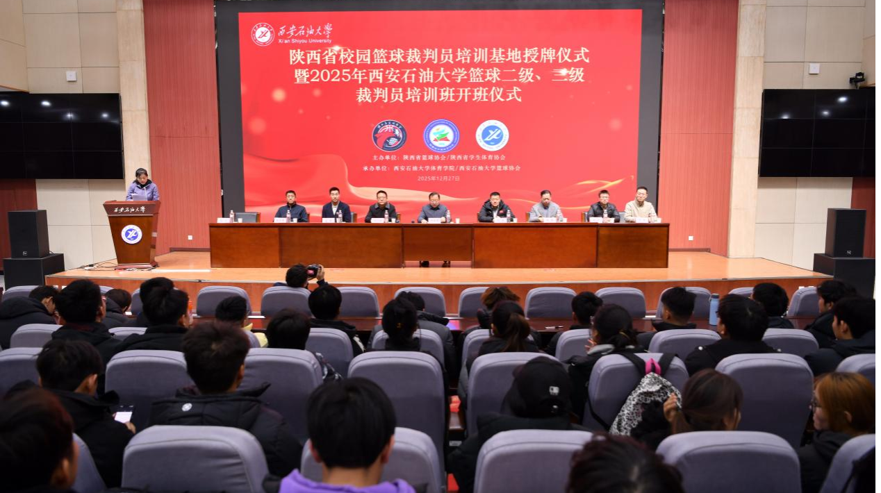 12月27日,陕西省校园篮球裁判员培训基地授牌仪式暨2025年西安石油大学篮球二级、三级裁判员培训班开班仪式在鄠邑校区弘石学术报告厅举行。副校长种宇宏,陕西省学生体育协会副秘书长程磊,陕西省篮球协会裁委会副主任、陕西省学生体育协会篮球项目裁委会副主任张鹏,陕西省篮协副秘书长、陕西省学生体协裁委会副主任、国际级裁判杜旭,体育学院负责人,篮球领域资深裁判专家及师生代表齐聚一堂,共同见证这一重要时刻。