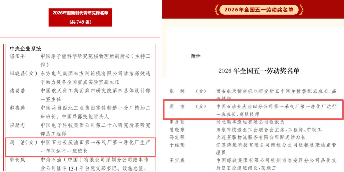 近日,2026年全国五一劳动奖、中国青年五四奖章暨新时代青年先锋奖评选结果正式揭晓。我校石油与天然气工程专业2022届硕士校友周洁,凭借长期深耕能源安全领域的坚守与突出实绩,成功斩获“全国五一劳动奖章”“新时代青年先锋奖”两项重磅荣誉,以青春之力践行使命担当,为母校增添荣光,为青年学子树立标杆。
