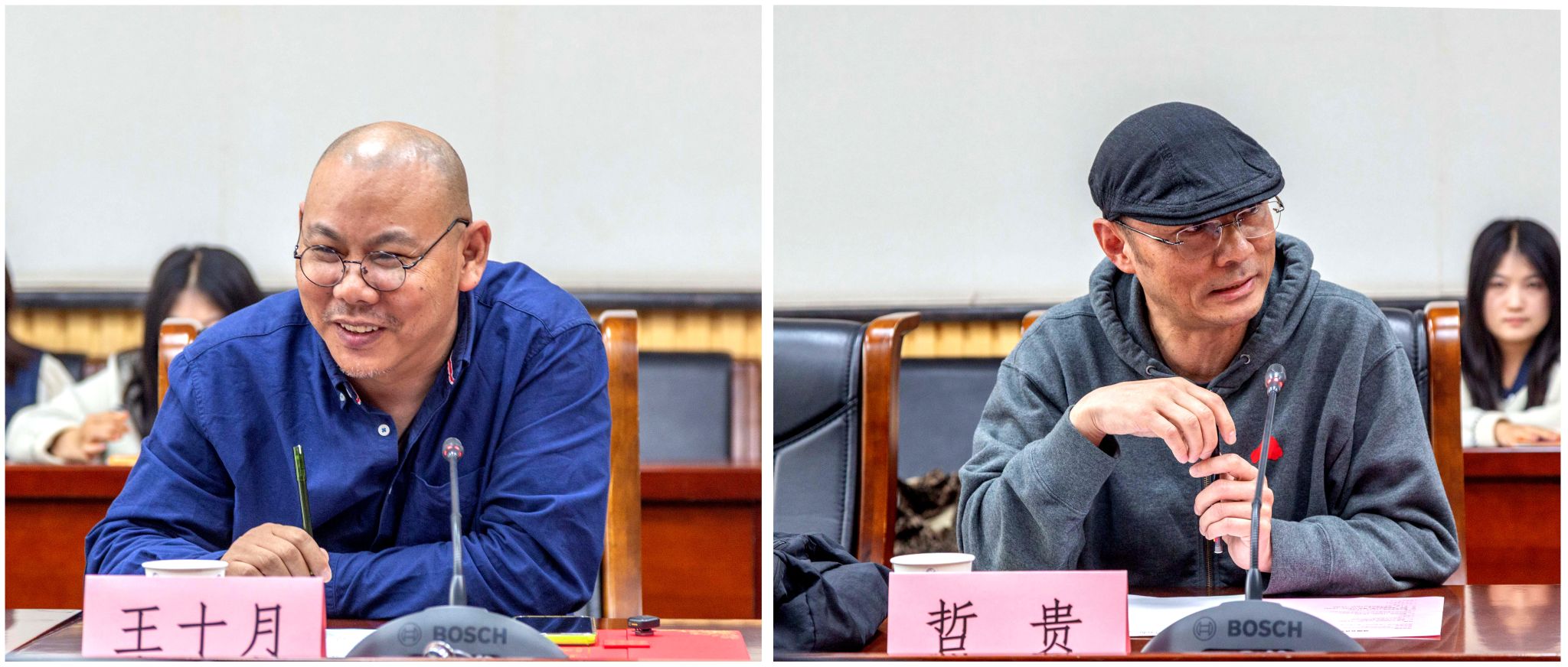 在作品分享环节,作家王十月、哲贵分别带来了《盲女孩》《我的无物之阵》与《造车记》的创作分享。王十月结合自身创作经历,讲述了作品背后的故事,探讨了文学创作中对人性、社会与个体命运的思考,引导同学们理解文学如何关照现实、书写时代。哲贵以《造车记》为切入点,分享了创作过程中对“信河街”的文化考察与思考,从叙事角度解读时代变迁中的个体与群体,让同学们感受到文学作品中蕴含的时代温度与人文关怀。作家们分享之后,现场师生踊跃提问,畅谈感悟,与两位作家展开了热烈的研讨交流,从文学观念到创作心得,从生活经验到人生思考,一问一答间,同学们对文学价值与人生意义有了更丰富、深刻的理解。