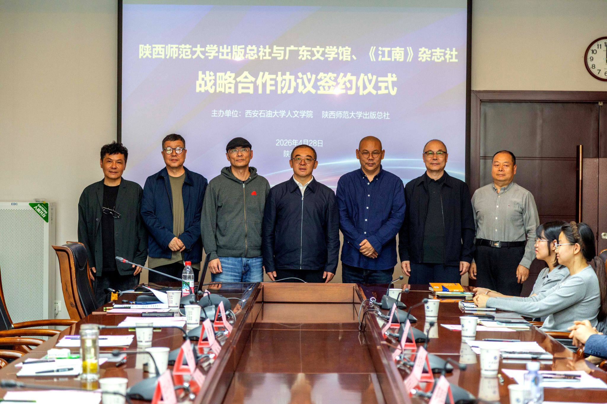 为深化产教融合、拓展文学育人平台,推动校园文化建设与人文教育深度融合,4月28日下午,陕西师范大学出版总社与广东文学馆、《江南》杂志社战略合作协议签约暨王十月、哲贵作品分享会在我校顺利举办。本次活动由我校人文学院、陕西师范大学出版社联合主办,以文为桥、以文育人,在师生与文学名家对话交流中充分彰显。