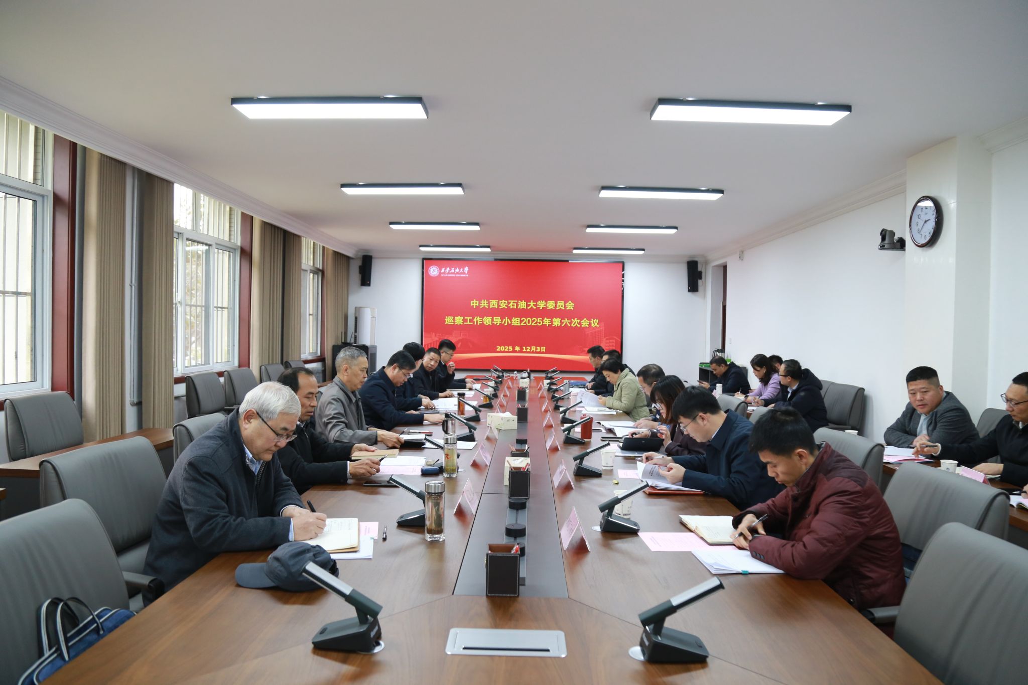 12月3日下午,学校党委巡察工作领导小组在鄠邑校区办公楼第三会议室召开2025年第六次会议,听取第三届党委第二轮巡察工作总体情况汇报,审议四个被巡察学院党委的巡察情况报告。校党委副书记、校长王进富出席会议并讲话。校党委副书记、纪委书记、监察专员,党委巡察工作领导小组副组长王辉强主持会议。学校党委巡察工作领导小组成员单位负责人参加会议。党委第一、第二巡察组和党委巡察办全体同志列席会议。