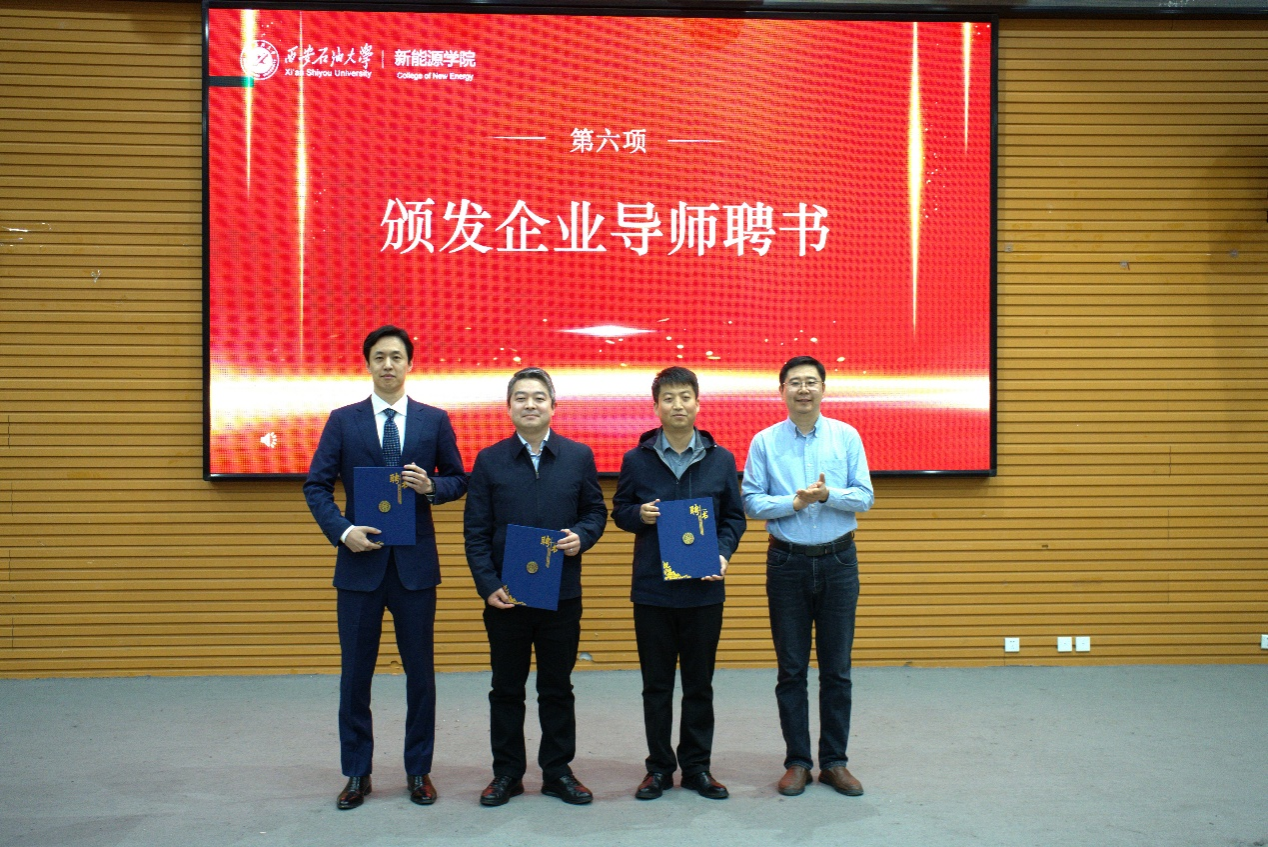 企业导师代表冉旭结合自身经历深入解读了当前光伏、新型储能产业的发展趋势与人才需求。他表示,新能源产业高质量发展亟需复合型拔尖创新人才,这也是校企携手开展协同育人的初心所在,同时对新能源学院聚焦“新能源与油气融合”的特色发展方向表示高度认可。作为企业导师,他郑重承诺将切实履行“架桥梁、传经验、育新人”的使命:将产业一线鲜活案例带进课堂,转化为优质教学资源;搭建校企实践桥梁,组织同学们走进生产车间、电站等一线场景参与实操锻炼;构建校企创新合作链,推动企业技术难题与学生科研项目精准对接、联合攻关。同时,他希望同学们筑牢专业根基,夯实基础学科知识,练就过硬专业技能;保持好奇之心,紧盯行业技术迭代趋势,在跨学科学习中挖掘创新点;锤炼实干之风,躬身实践、动手动脑,在解决实际问题中积累经验、实现成长;胸怀家国情怀,将个人发展与国家能源安全、“双碳”目标紧密结合,自觉践行新能源人的使命与担当。
