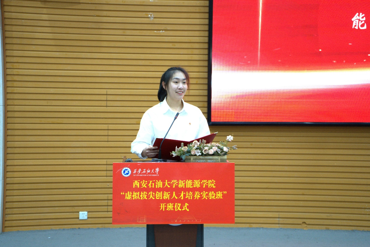 能科2501班张海婷作为学生代表发言,她结合自身感悟,深刻阐释了对实验班“虚拟”模式与“拔尖”定位的理解,号召全体同学立大志、明方向、勤奋进,善用校内外优质资源、秉持抱团成长理念,既要筑牢专业知识根基,也要心怀家国使命担当,在新能源发展赛道上脚踏实地、逐梦前行,用青春之智、青春之力书写能源强国建设的新篇章。