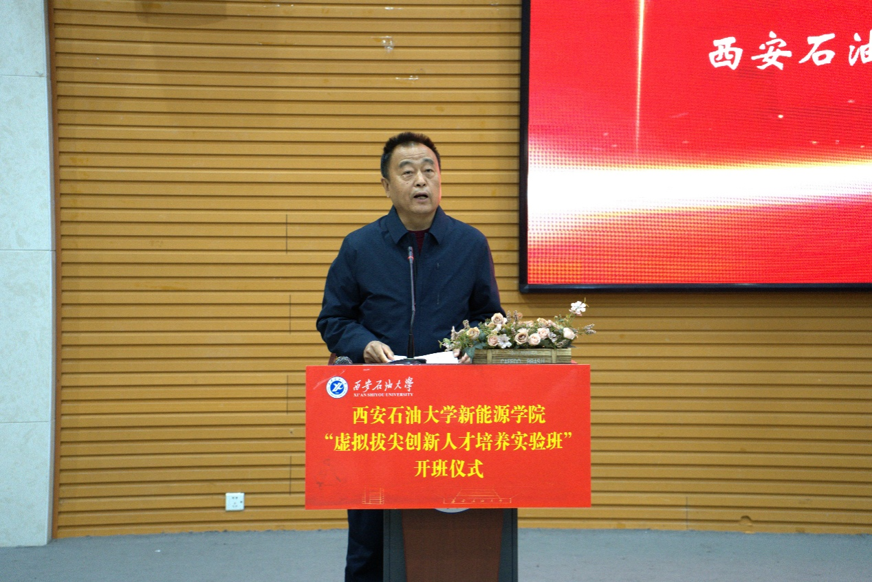 程永清首先代表学校,向实验班的正式成立表示热烈祝贺,向受聘的企业导师、班主任致以诚挚敬意,向成功入选的同学们表示衷心祝贺,同时向为实验班筹备付出辛勤努力的各相关单位和工作人员表示感谢。他指出,新能源学院设立虚拟拔尖创新人才培养实验班,是学校主动适配AI时代知识快速迭代趋势、推进人才培养体系重塑的具体实践,更是破解人才培养与新能源产业发展脱节难题、彰显能源特色办学价值的重要探索。他从服务国家“双碳”战略与能源强国建设、推动学校特色发展与人才培养改革、赋能学生成长成才与职业发展三个维度,深刻阐释了实验班成立的重要意义与多重价值。结合学校人才培养体系重塑工作要求,针对推动实验班建设落地见效,他分别对学院、导师和同学们提出殷切希望:学院要精耕细作、抓实抓细各项工作,严格落地培养方案、强化校内外资源整合、实施科学动态管理,全力打造学校拔尖人才培养的示范样板;导师要凝心聚力、做好协同育人,切实当好青年学子成长成才的引路人,推动学术培养与实践育人无缝衔接、同频共振;全体同学要珍惜优质平台与学习机遇,笃行不怠、奋勇争先,立大志、勤学习、重实践、修品德,始终将个人理想融入国家能源事业发展大局,努力成长为新能源领域可堪大用、能担重任的拔尖创新人才,为能源强国建设贡献西石大青春力量。最后,程永清宣布实验班正式开班。