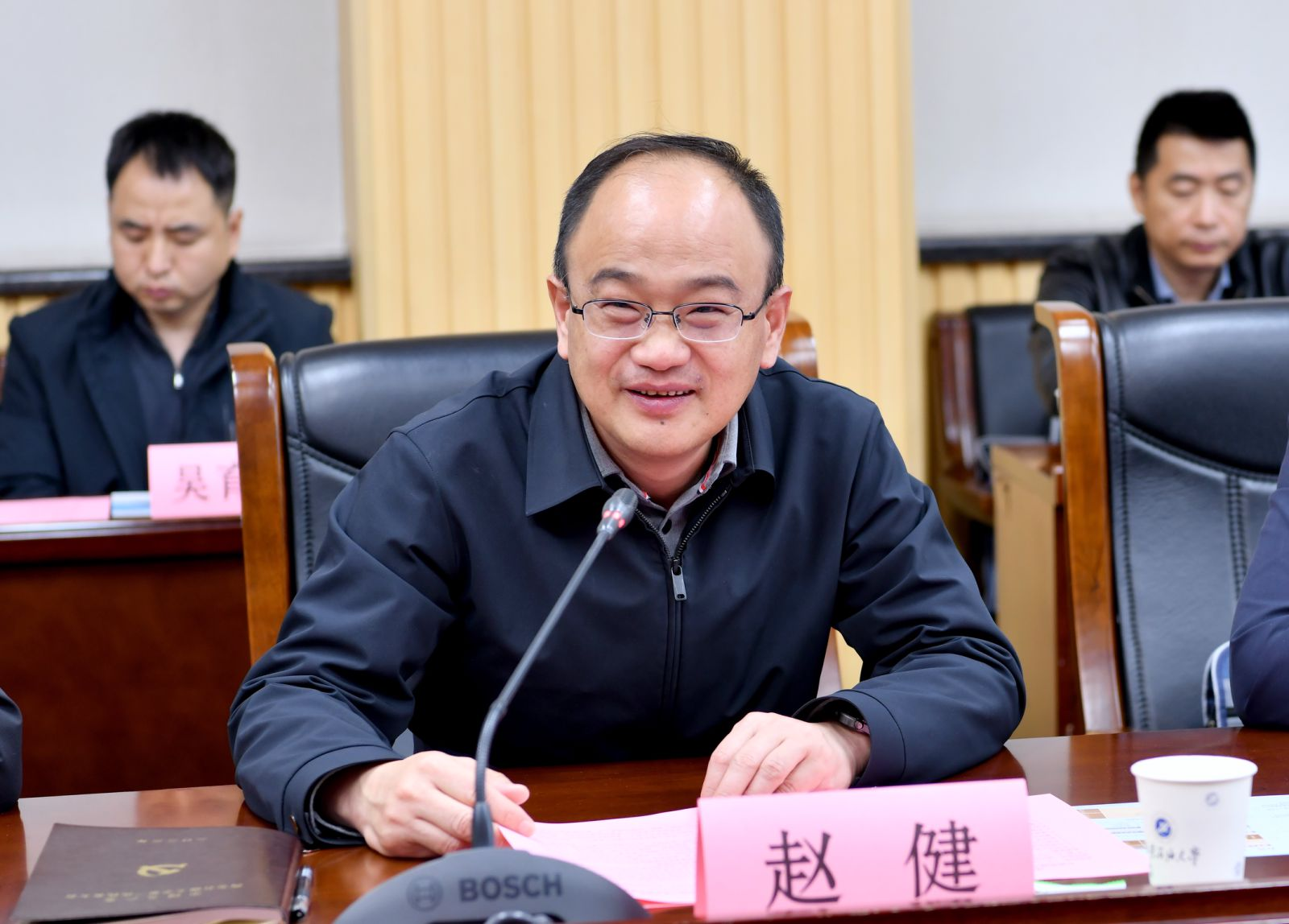 校地对接交流会在我校鄠邑校区第二会议室举行,副校长赵健、种宇宏,盐城市科技局副局长、建湖县党组成员、科技镇长团团长陈永井,中共建湖县委组织部副部长、人才办主任孙盘桧及双方相关部门负责人、企业家代表参会,会议由机械工程学院院长刘少胡主持。